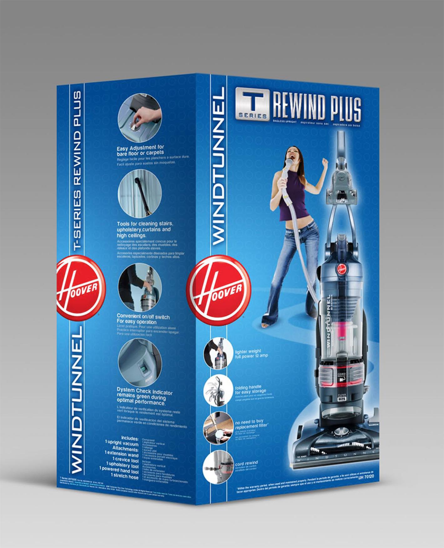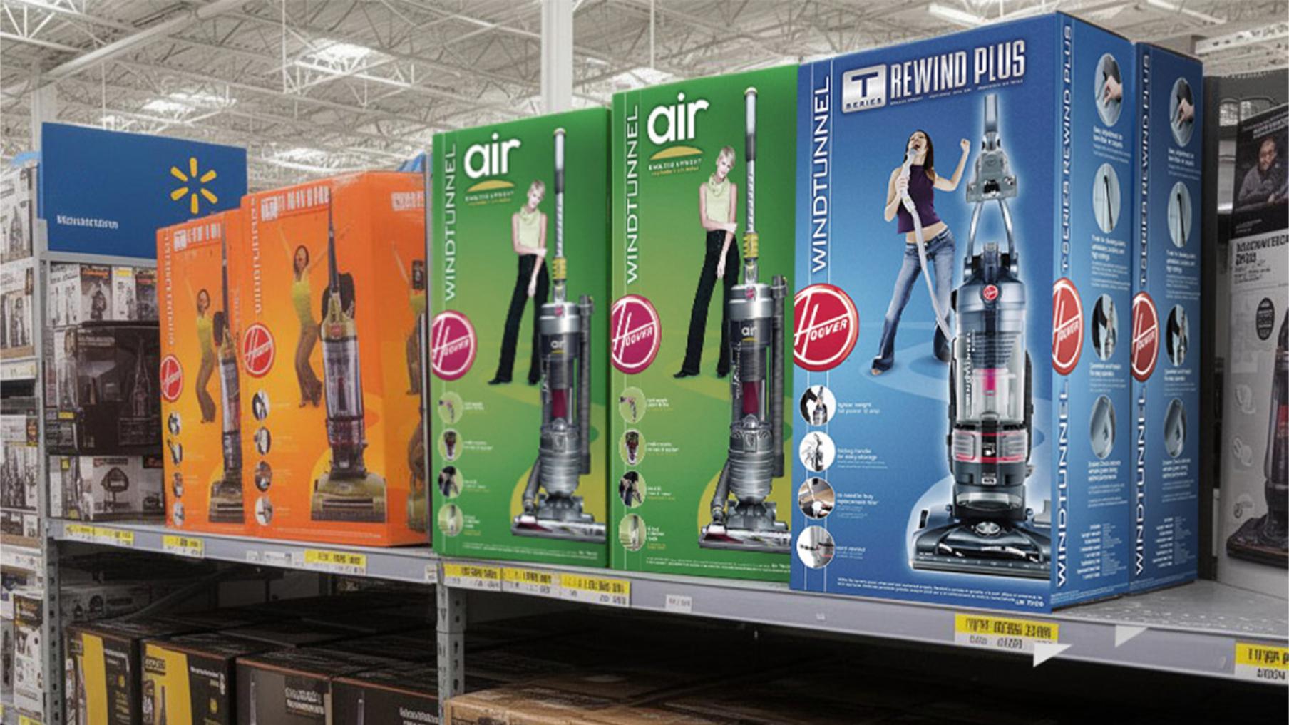 Hoover asked for a fresh, brighter look for their best-selling WindTunnel vacuum line. Research revealed a clear split: primary buyers (women) responded emotionally to faces and children on packaging, while men focused more on features and performance.